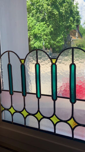 Pour cette fenêtre sur rue, nous avons choisi d'enlever le film miroir afin d'y adapter un brise vue en vitrail.